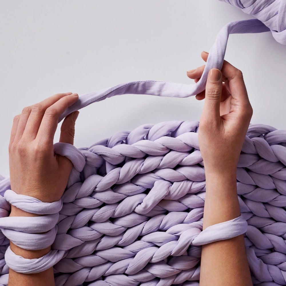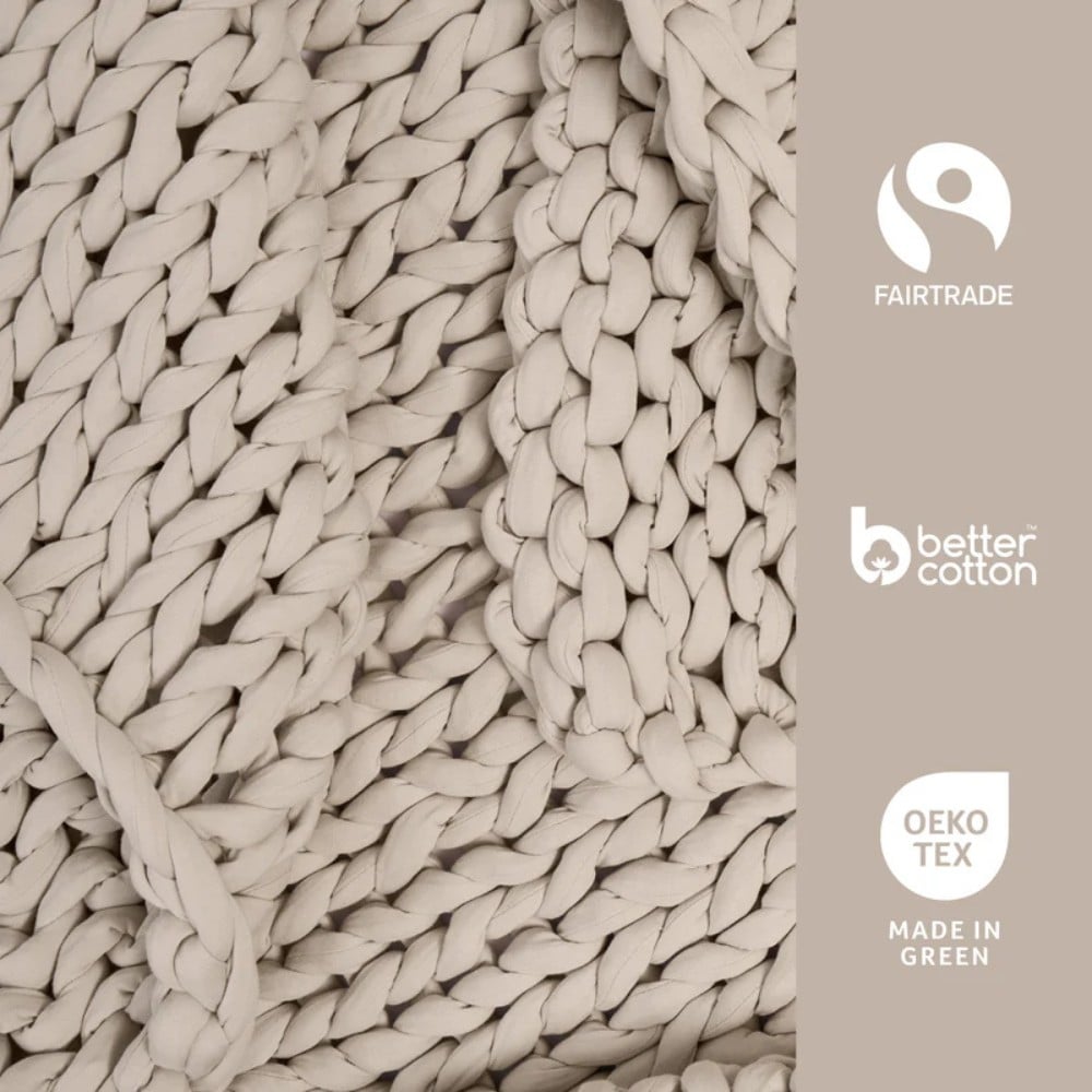 Das wohltuende Gewicht der schweren, handgestrickten Decken stammt zu 100% aus Bio-Baumwolle. Im flauschigen Mix aus dickem Garn und grossen Maschen stecken viele wissenschaftliche Erkenntnisse, die gut für dich und den Planeten sind.
