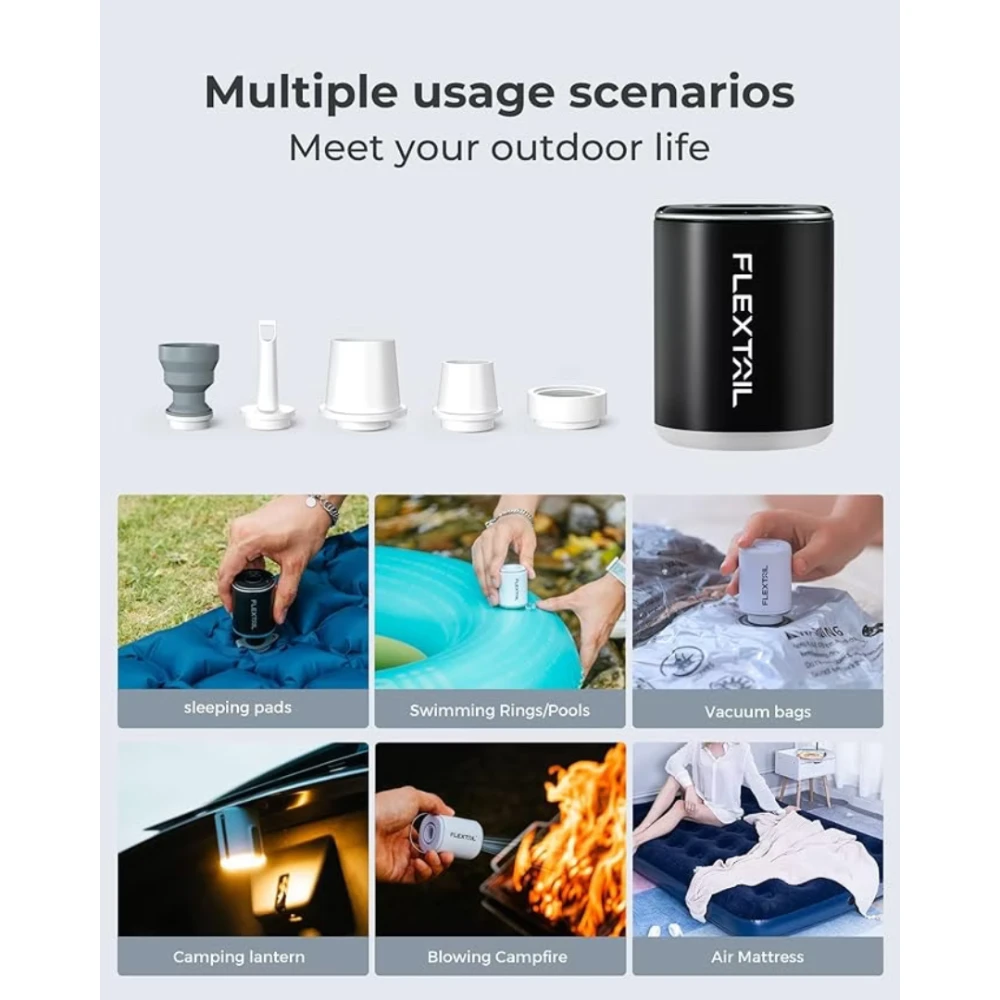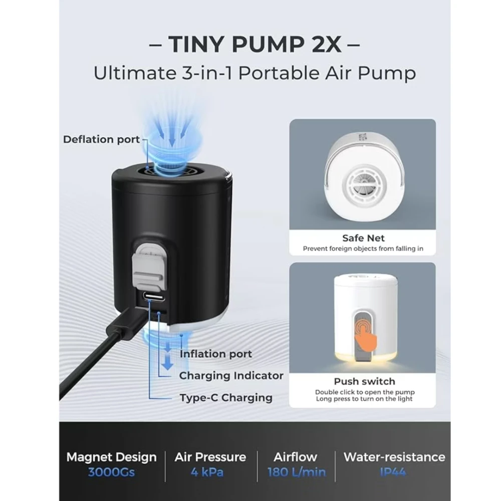 Die Tiny Pump 2X überzeugt durch starke Leistung, kompaktes Design und eine praktische integrierte Campinglampe. Diese ultraleichte 3-in-1 Pumpe ist kaum grösser als deine AirPods und passt in jede Hosentasche – perfekt für Camping, Strand oder spontane Abenteuer. Sie bläst Luftmatratzen, Bälle und Schwimmringe schnell auf, entlüftet Vakuumbeutel in Sekunden und leuchtet mit bis zu 230 Lumen dein Lager aus.